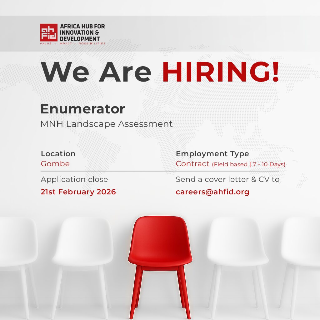 HOW TO APPLY: > Send your CV and Cover Letter directly to careers@ahfid.org with the subject line: Enumerator – MNH Landscape Assessment (Gombe)